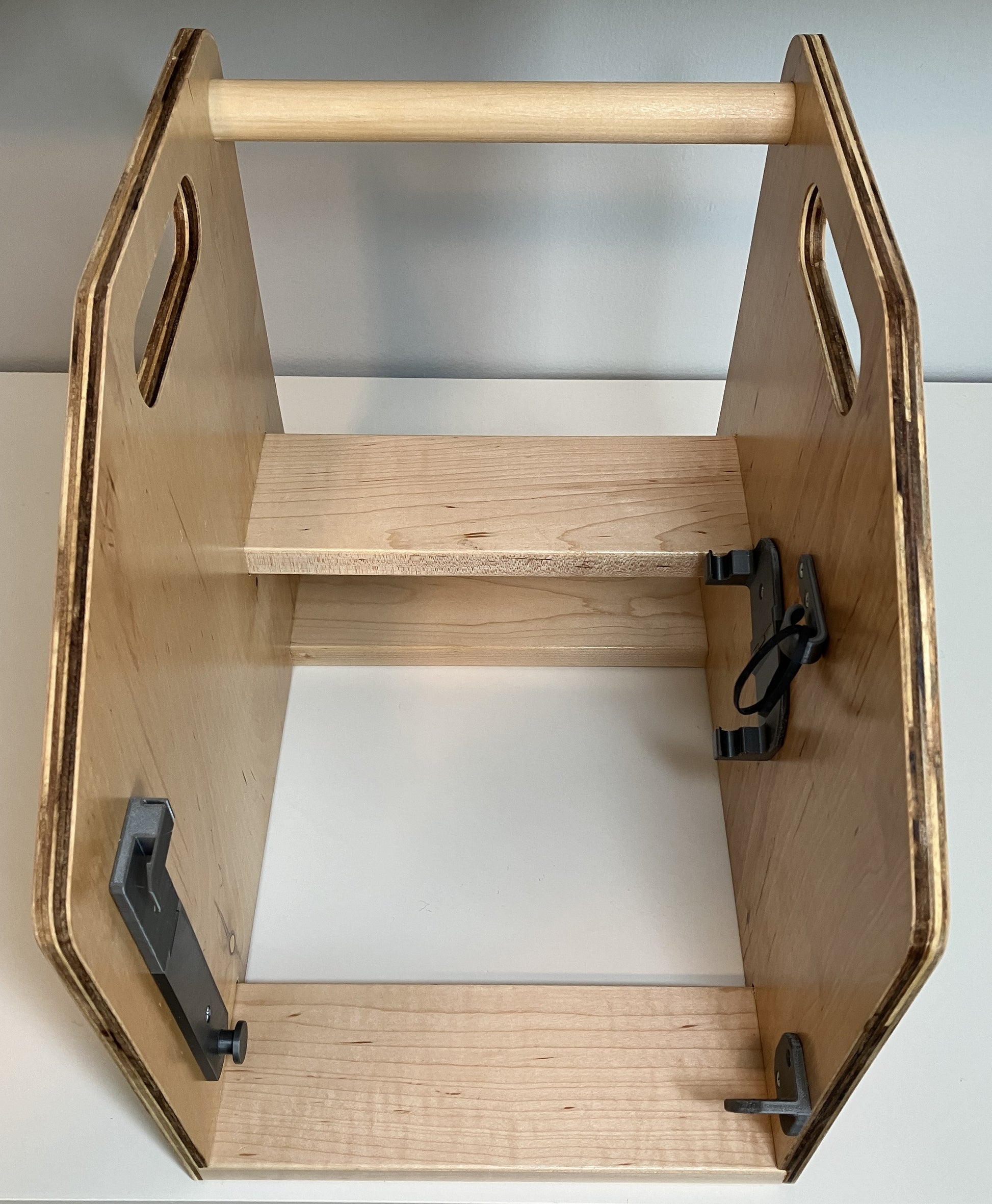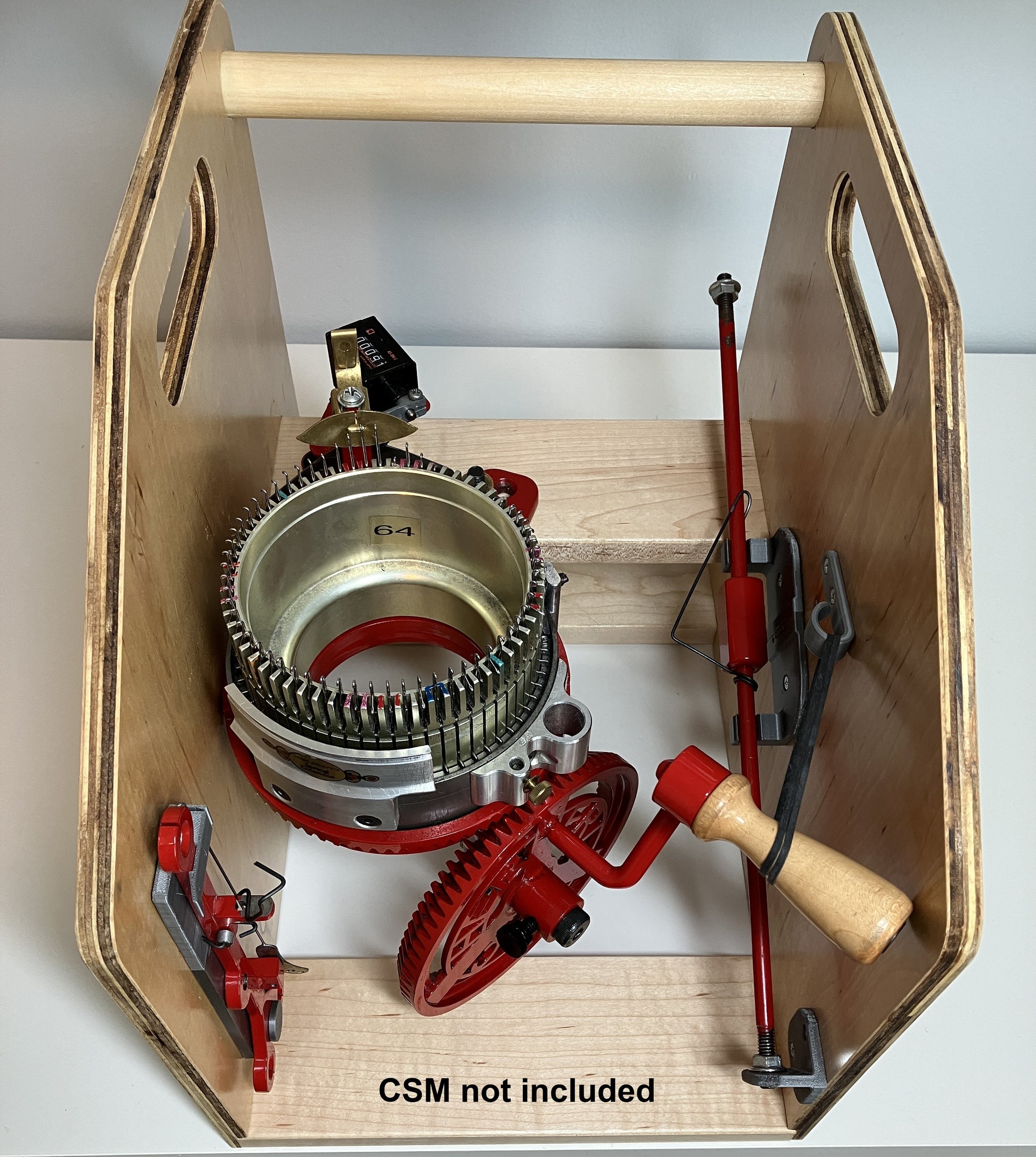 Easily transport your Erlbacher Speedster CSM in our hand crafted wooden carrier. This carrier is constructed in our workshop and is made of birch plywood with hardwood cross members, both finished to provide protection to the wood. The carrier features 3D printed clips for storing your mast and yarn guide safely during transport should you choose to remove them. The cutouts on the side serve a dual purpose: 1) easy to hold handles and 2) as slots to slip your vehicle's seatbelt through during transportation. The carrier is shipped assembled.