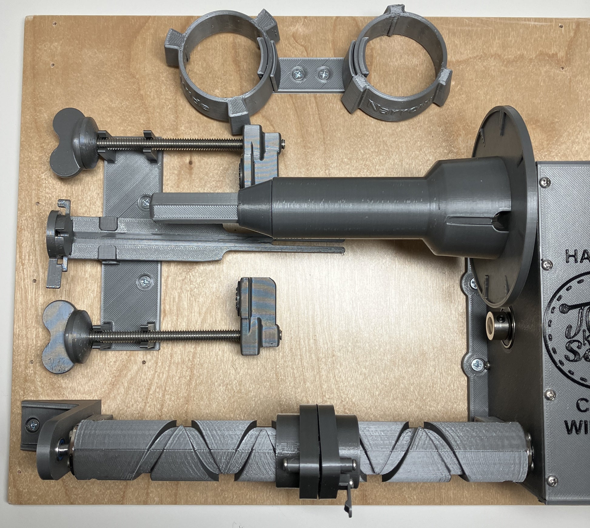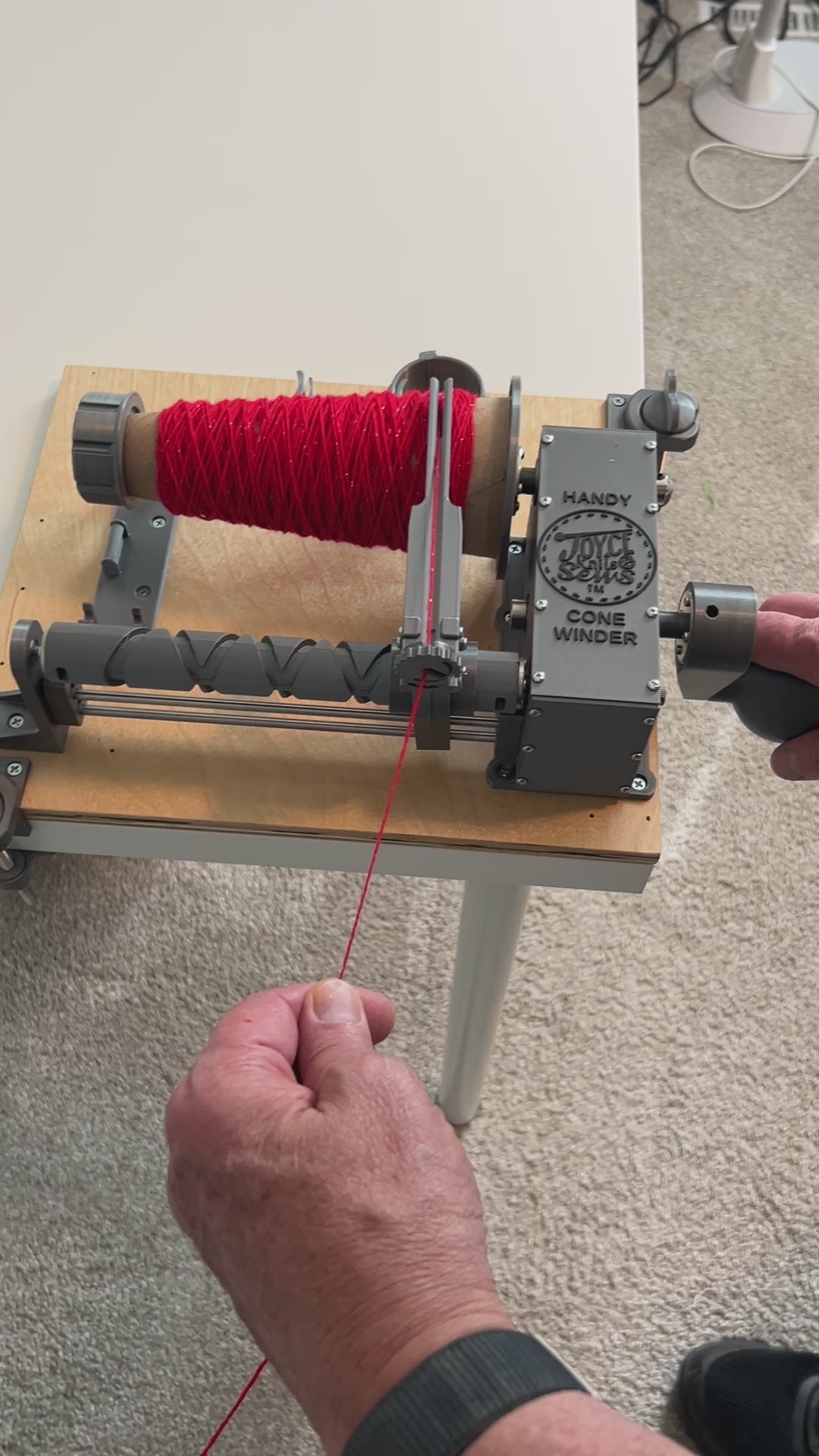The Handy Cone Winder™ is a hand crank winder which uses a similar level winding mechanism as our Speedy Cone Winder 2.0™. It contains a cone holder and adapters for three sizes of cones: 1) bottom diameter 2.625", top diameter 0.5", height 6.75"; 2) bottom diameter 2.75”, top diameter 1.375”, height 6.75”; 3) bottom diameter 1.875", top diameter 1", height 7". The winder is mounted to a finished plywood panel and comes with clamps for securing it to a work surface. It is shipped configured for a right handed user and can be converted by the user for left handed cranking. Five cardboard cones (#2 above) are included.